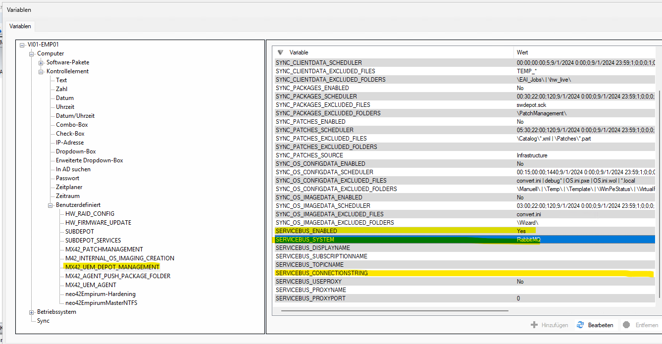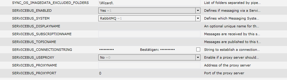 wir haben da ziemlich den Standard gelassen aber Du musst den oben angesprochenen String mit “amqp://rabbitmq:xxxxxxxxx” im ConnectionString eingeben (siehe auch Empirum-ServiceBus Service).