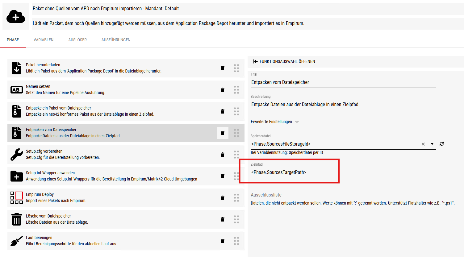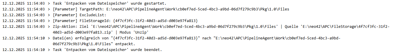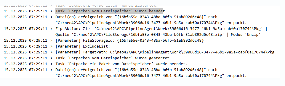 Falls dies das Problem nicht beheben sollte, schauen Sie mal bitte im Log der Pipeline, ob der Task ‚Entpacken vom Dateispeicher‘ sauber gelaufen ist: