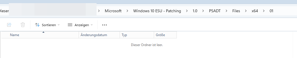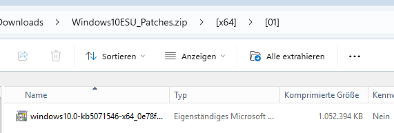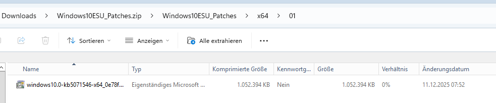 hierzu habe ich mir das Dezember Update für WIndows 10 ESU manuell in x86 sowie x64 heruntergeladen. Eine entsprechende Struktur erstellt wie in der Anleitung, ausser natürlich die Ordner 2 bis 5 da ich ja nur einen Patch pro Achitektur habe, und als ZIP in den Dateispeicher hochgeladen: