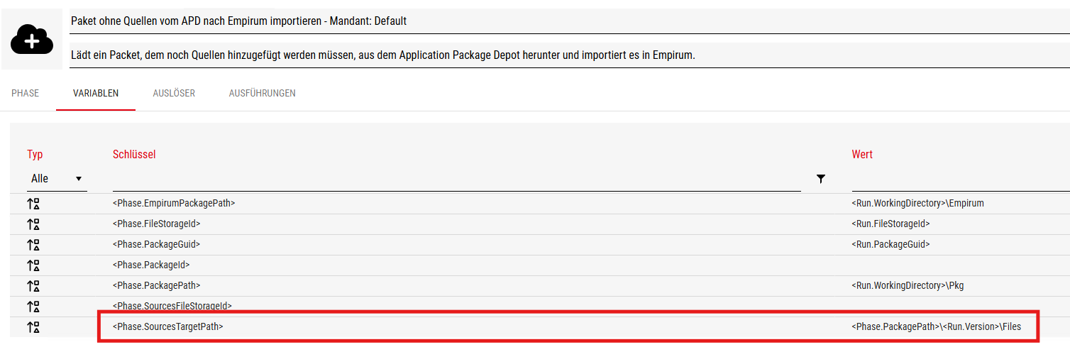 Evtl. sonst die standard Pipeline “Paket ohne Quellen vom APD nach Empirum importieren” über die Empirum Bridge Konfiguration noch mal neu erzeugen lassen.
