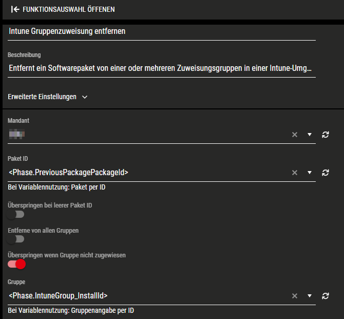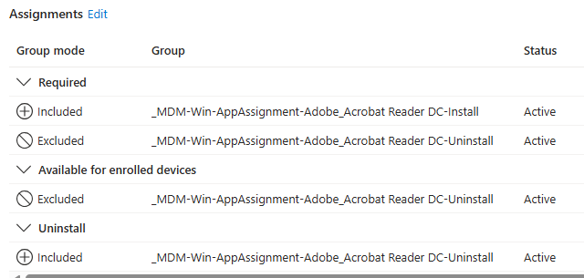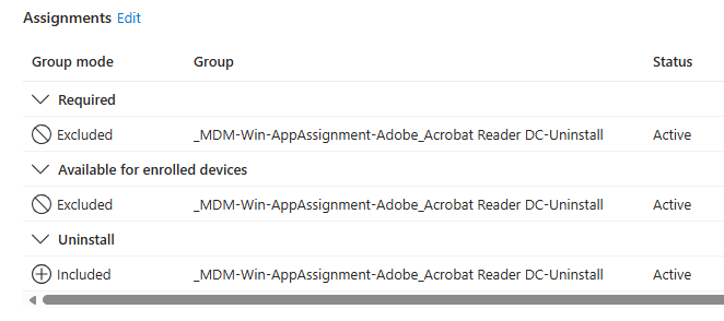 Wir haben ein 3-phasiges “Test-Pilot-Produktiv”-Schema und hier werden während dieser Phasen die jeweiligen Intune-Gruppen (Test, Pilot, Install) bei der App hinzu- oder weggenommen (Zuweisung Erforderlich & Enthalten). Erreicht ein Paket Phase 3 = Produktiv, wird unter anderem bei der vorigen Version die Install-Gruppe rausgenommen:
