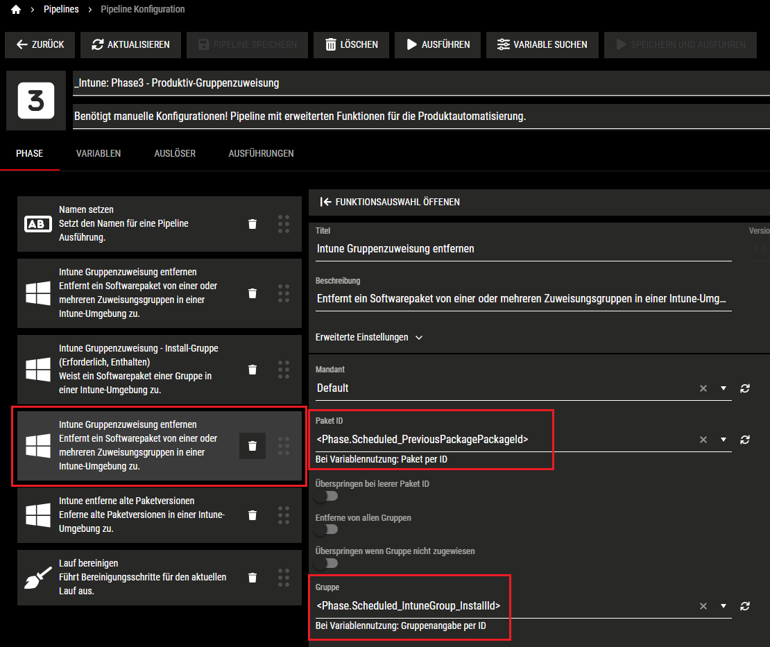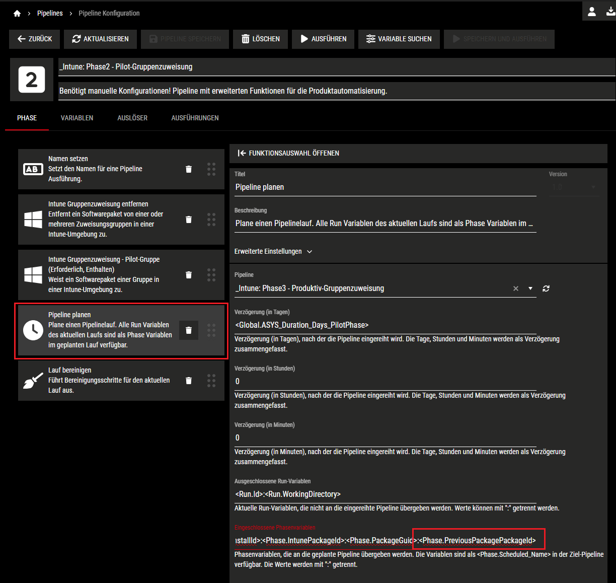 Die beiden Variablen bei PaketID und Gruppe kommen aus der vorigen Phase (erkennbar am “Scheduled_”-Präfix) die wir dort im “Pipeline planen”-Task mitgeben: