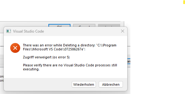 Wir haben aktuell Probleme bei Updates von Visual Studio Code - folgendes Fehlerbild mit abwechselndem Ordner in der Meldung tritt auf: