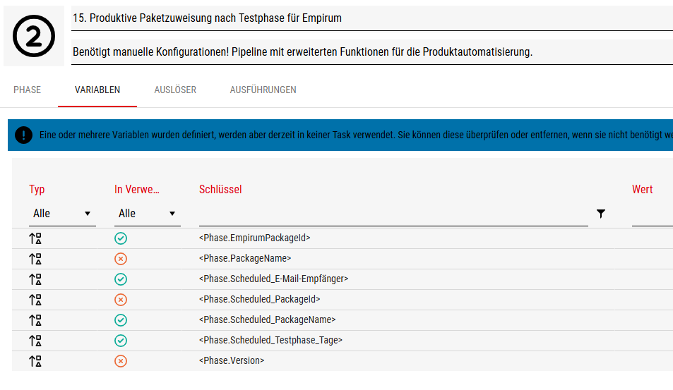 Run-Variablen stehen ab dem erzeugenden Task zur Verfügung und werden dann zu Phasen-Variable, wenn eine neue Pipeline über einen Scheduler gestartet wird.