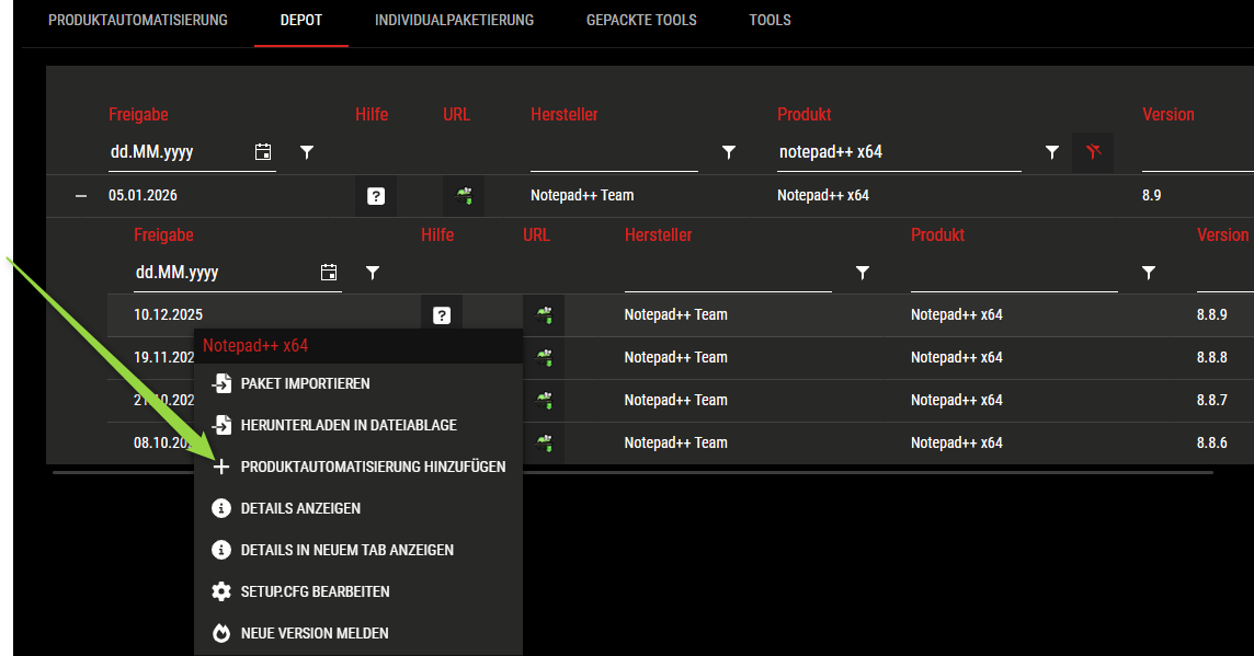 Im Rahmen der Vorbereitung eines Rollbacks einer Softwareversion habe ich die betroffene Anwendung ausgewählt und anschließend über „Paketautomatisierung hinzufügen“ die entsprechende Automatisierung ergänzt.